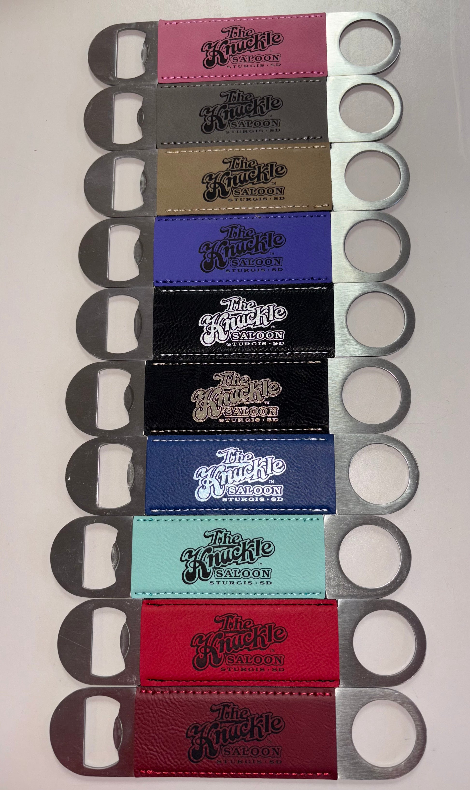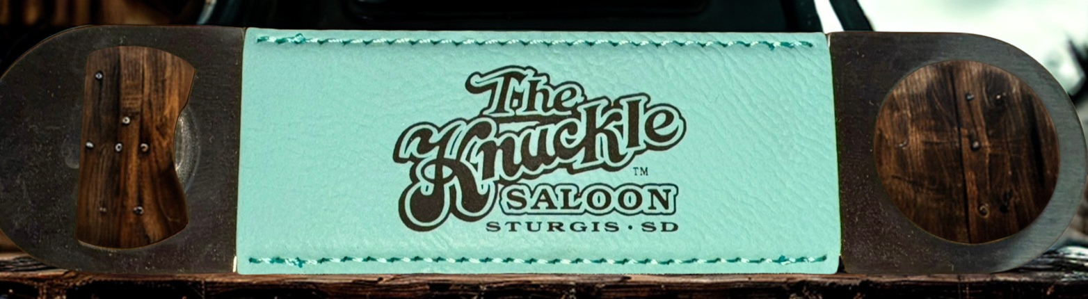 The Traditional Bottle opener has The Knuckle Saloon logo on one side and is Blank on the back side. Celebrate 25 years of The Knuckle Saloon with the limited-edition bottle opener—built tough and ready for every party. Each opener is wrapped in a durable leather-like sleeve and stamped with The Knuckle Saloon logo on one side and the special 25th Anniversary design on the other.