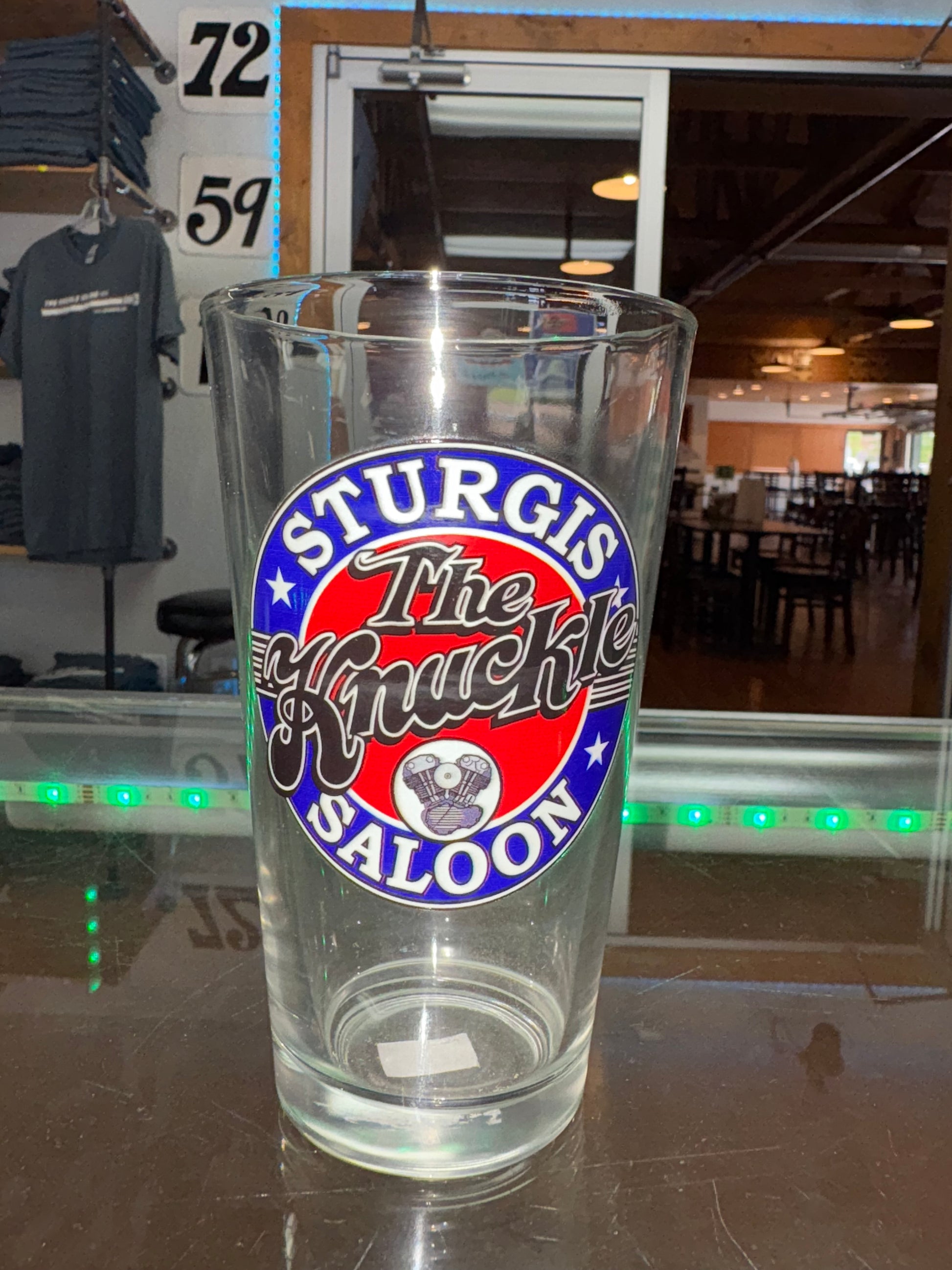Raise a toast to Sturgis with the official Knuckle Saloon Shot Glass! Featuring the bold and iconic Knuckle Saloon logo in red, white, and blue, this glass is the perfect rally keepsake or gift for any biker enthusiast.